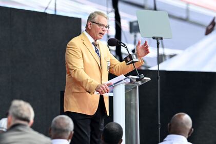 Pro Football Hall of Fame: Joe Klecko, a member of the Jets' "New York Sack Exchange," speaks during the 2023 Pro Football Hall of Fame enshrinement ceremony. (Nick Cammett/Getty Images)