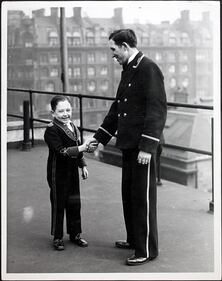 Queen Mary Daniel McLaughlin (left) of Clydebank in Scotland receives congratulations from a fellow employee upon the attainment of his ambition to secure a post as pageboy on the ocean liner 'RMS Queen Mary', Glasgow, Scotland. Dan, who is at the time a pageboy at the Adelphi Hotel in Glasgow, is 3 foot 6 inches tall, and will be 21 on his next birthday. (Photo by Fox Photos/Hulton Archive/Getty Images) (Hulton Archive/Getty Images)