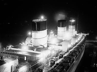 Queen Mary 30th December 1936: The liner 'Queen Mary' in dock at Southampton where workmen are working through the night to make alterations to the ship. (Photo by E. Phillips/Fox Photos/Getty Images) (E. Phillips/Getty Images)