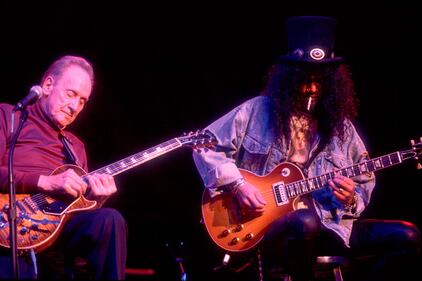 Through the years American Jazz and Blues musician Les Paul (born Lester Polfuss, 1915 - 2009) (left) and British-American Rock musician Slash (born Saul Hudson) play guitars together at the House of Blues, Chicago, Illinois, December 2, 1996. (Photo by Paul Natkin/Getty Images) (Paul Natkin/Getty Images)