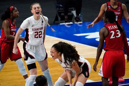 Photos: Stanford holds off Arizona 54-53 to win NCAA women's basketball title Stanford players celebrate at the end of the championship game against Arizona in the women's Final Four NCAA college basketball tournament, Sunday, April 4, 2021, at the Alamodome in San Antonio. Stanford won 54-53. (AP Photo/Eric Gay)