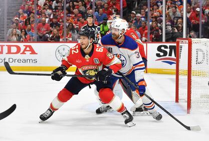 Game 7: Zach Hyman of the Edmonton Oilers turns to play the puck away from Gustav Forsling of the Florida Panthers. (Dave Sandford/NHLI via Getty Images)