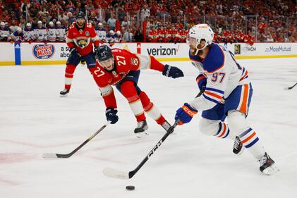 Game 7: Edmonton's Connor McDavid, right, skates Eetu Luostarinen of the Florida Panthers during the second period. (Bruce Bennett/Getty Images)