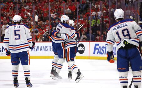 Game 7: Mattias Janmark (13) of the Edmonton Oilers celebrates with Brett Kulak (27) after his game-tying goal in the first period. (Dave Sandford/NHLI via Getty Images)