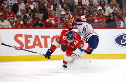 Game 7: Zach Hyman of the Edmonton Oilers dives past Eetu Luostarinen of the Florida Panthers while going after a loose puck during the second period. (Bruce Bennett/Getty Images)