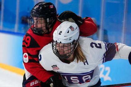 Silver medal Canada's Marie-Philip Poulin collides United States' Lee Stecklein during the women's gold medal hockey game at the 2022 Winter Olympics, Thursday, Feb. 17, 2022, in Beijing. (AP Photo/Petr David Josek) (Petr David Josek/AP)