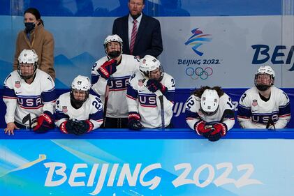 Silver medal United States reacts after losing to Canada in the women's gold medal hockey game at the 2022 Winter Olympics, Thursday, Feb. 17, 2022, in Beijing. (AP Photo/Jae C. Hong) (Jae C. Hong/AP)