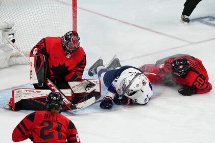 Silver medal United States' Hilary Knight (21) slides into Canada goalkeeper Ann-Renee Desbiens (35) during the women's gold medal hockey game at the 2022 Winter Olympics, Thursday, Feb. 17, 2022, in Beijing. At left is Canada's Sarah Nurse (20). (AP Photo/Petr David Josek) (Petr David Josek/AP)