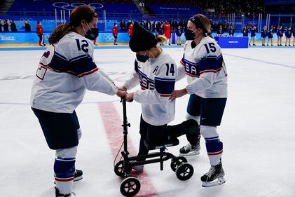 Silver medal Injured United States' player Brianna Decker (14) is helped across the ice for the medal ceremony after Canada defeated the United States in the women's gold medal hockey game at the 2022 Winter Olympics, Thursday, Feb. 17, 2022, in Beijing. (AP Photo/Matt Slocum) (Matt Slocum/AP)