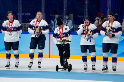 Silver medal United States poses after receiving their silver medals after being defeated by Canada in women's gold medal hockey game at the 2022 Winter Olympics, Thursday, Feb. 17, 2022, in Beijing. (AP Photo/Petr David Josek) (Petr David Josek/AP)