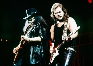 Travis Tritt ATLANTA circa 1992: Gary Rossington (hat) of Lynyrd Skynyrd joins Travis Tritt on stage at The Omni Coliseum in Atlanta, Ga. circa 1992 (Photo by Rick Diamond/Getty Images) (Rick Diamond/Getty Images)