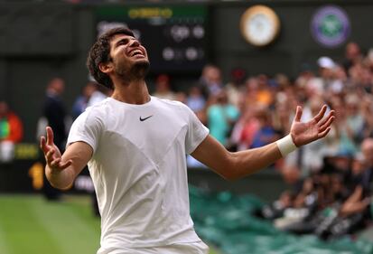 Wimbledon men’s championship 2023 LONDON, ENGLAND - JULY 16: Carlos Alcaraz of Spain celebrates victory following the Men's Singles Final against Novak Djokovic of Serbia on day fourteen of The Championships Wimbledon 2023 at All England Lawn Tennis and Croquet Club on July 16, 2023 in London, England. (Photo by Clive Brunskill/Getty Images) (Clive Brunskill/Getty Images)