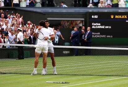 Wimbledon men’s championship 2023 LONDON, ENGLAND - JULY 16: Carlos Alcaraz of Spain celebrates winning Championship Point as he embraces Novak Djokovic of Serbia in the Men's Singles Final on day fourteen of The Championships Wimbledon 2023 at All England Lawn Tennis and Croquet Club on July 16, 2023 in London, England. (Photo by Clive Brunskill/Getty Images) (Clive Brunskill/Getty Images)