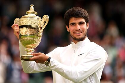 Wimbledon men’s championship 2023 LONDON, ENGLAND - JULY 16: Carlos Alcaraz of Spain with the Men's Singles Trophy following his victory in the Men's Singles Final against Novak Djokovic of Serbia on day fourteen of The Championships Wimbledon 2023 at All England Lawn Tennis and Croquet Club on July 16, 2023 in London, England. (Photo by Julian Finney/Getty Images) (Julian Finney/Getty Images)