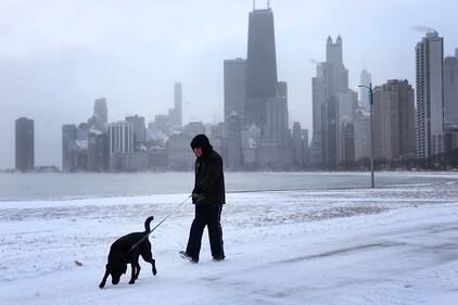 Winter weather CHICAGO, ILLINOIS - DECEMBER 23: A man walks his dog along the lakefront near downtown as temperatures hover about -6 degrees on December 22, 2022 in Chicago, Illinois. Sub-zero temperatures are expected to grip the city for the next couple of days with wind chill temperature dipping as low as -40 degrees. (Photo by Scott Olson/Getty Images) (Scott Olson/Getty Images)