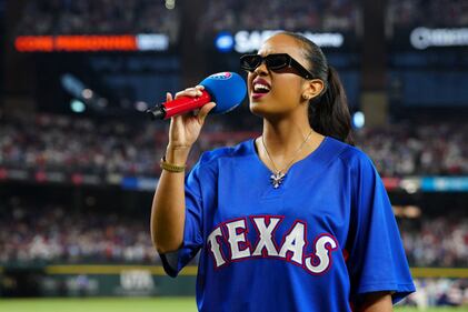 2023 World Series: R&B performer H.E.R. sings the national anthem before Game 1. (Daniel Shirey/MLB Photos via Getty Images)