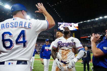 2023 World Series: Adolis García of the Texas Rangers gets a lift after his game-winning home run in Game 1. (Mary DeCicco/MLB Photos via Getty Images)
