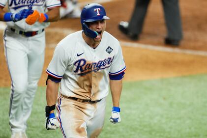 2023 World Series: Corey Seager of the Texas Rangers reacts after hitting a game-tying, two-run home run in the bottom of the ninth during Game 1. (Cooper Neill/MLB Photos via Getty Images)