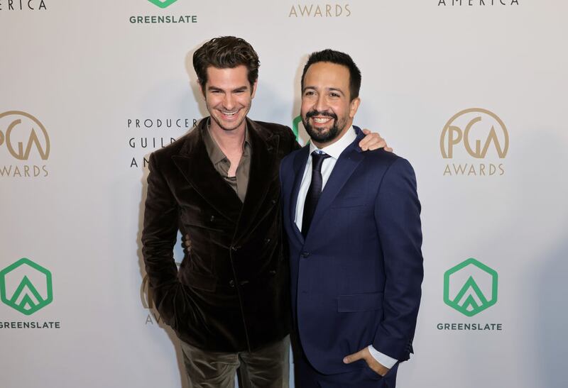 33rd Annual Producers Guild Awards Arrivals LOS ANGELES, CALIFORNIA - MARCH 19: (L-R) Andrew Garfield and Lin-Manuel Miranda attend the 33rd Annual Producers Guild Awards at Fairmont Century Plaza on March 19, 2022 in Los Angeles, California. (Photo by Kevin Winter/Getty Images) (Kevin Winter/Getty Images)