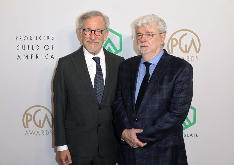33rd Annual Producers Guild Awards Arrivals LOS ANGELES, CALIFORNIA - MARCH 19: (L-R) Steven Spielberg and George Lucas attend the 33rd Annual Producers Guild Awards at Fairmont Century Plaza on March 19, 2022 in Los Angeles, California. (Photo by Kevin Winter/Getty Images) (Kevin Winter/Getty Images)