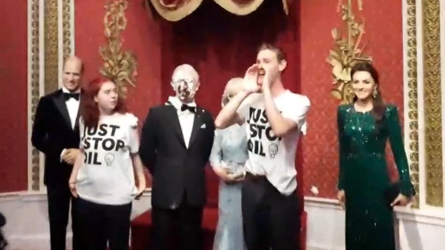 The environmental advocacy group “Just Stop Oil” took credit for the vandalism in a news release, saying two of its supporters covered the waxwork model of the king with chocolate cake as they demand that “the government halts all new oil and gas licenses and consents.”
