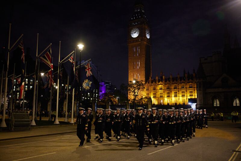 Photos: Queen Elizabeth II lies in state as thousands wait through night to pay respects Soldiers march through Parliament Square during a rehearsal on September 15, 2022, for Queen Elizabeth II's funeral in London. (Alex McBride/Getty Images)