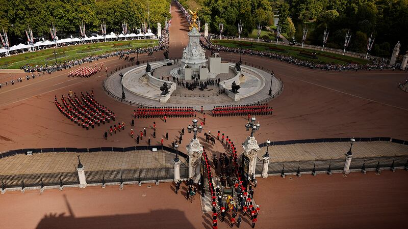 Photos: Thousands line procession route to honor Queen Elizabeth II LONDON, ENGLAND - SEPTEMBER 14: The coffin containing Queen Elizabeth II is carried in a ceremonial procession from Buckingham Palace to the Palace of Westminster on September 14, 2022 in London, United Kingdom. Queen Elizabeth II's coffin is taken in procession on a Gun Carriage of The King's Troop Royal Horse Artillery from Buckingham Palace to Westminster Hall where she will lay in state until the early morning of her funeral. Queen Elizabeth II died at Balmoral Castle in Scotland on September 8, 2022, and is succeeded by her eldest son, King Charles III. (Photo by Carl Court/Getty Images) (Carl Court/Getty Images)