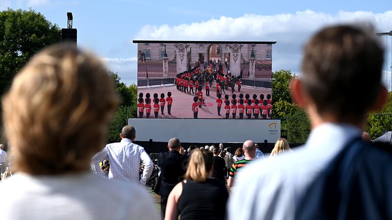 Photos: Crowds gather ahead of Queen Elizabeth II's coffin procession Coldstream Guards march ahead of the procession of Queen Elizabeth II's coffin from Buckingham Palace to the Palace of Westminster on September 14, 2022 in London, United Kingdom. Queen Elizabeth II's coffin is taken in procession on a Gun Carriage of The King's Troop Royal Horse Artillery from Buckingham Palace to Westminster Hall where she will lay in state until the early morning of her funeral. Queen Elizabeth II died at Balmoral Castle in Scotland on September 8, 2022, and is succeeded by her eldest son, King Charles III. (WPA Pool/Getty Images)
