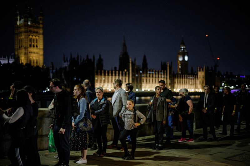 Photos: Queen Elizabeth II lies in state as thousands wait through night to pay respects People queue along the Thames Embankment as tens of thousands of people join queues to see Queen Elizabeth II lying in state at Westminster Hall on September 14, 2022, in London. (Rob Pinney/Getty Images)