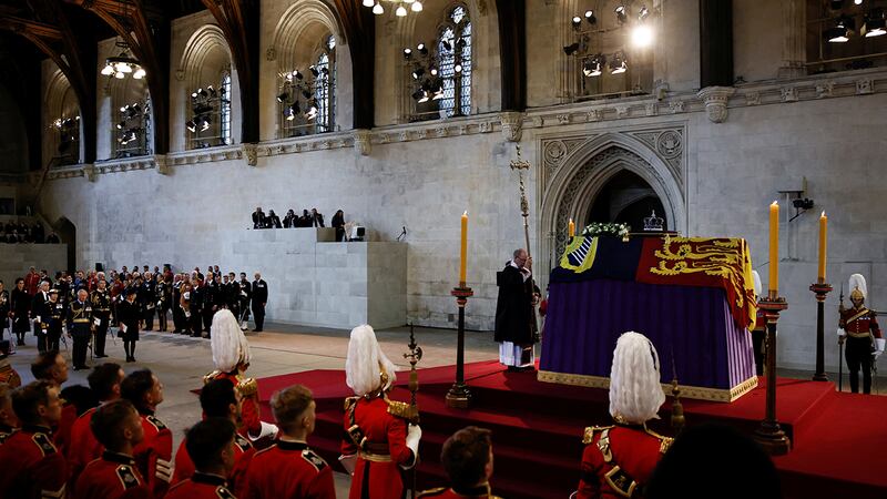 Photos: Thousands line procession route to honor Queen Elizabeth II A general view as the coffin carrying Queen Elizabeth II rests in Westminster Hall for the Lying-in State on September 14, 2022 in London, England. Queen Elizabeth II's coffin is taken in procession on a Gun Carriage of The King's Troop Royal Horse Artillery from Buckingham Palace to Westminster Hall where she will lay in state until the early morning of her funeral. Queen Elizabeth II died at Balmoral Castle in Scotland on September 8, 2022, and is succeeded by her eldest son, King Charles III. (Dan Kitwood/Getty Images)