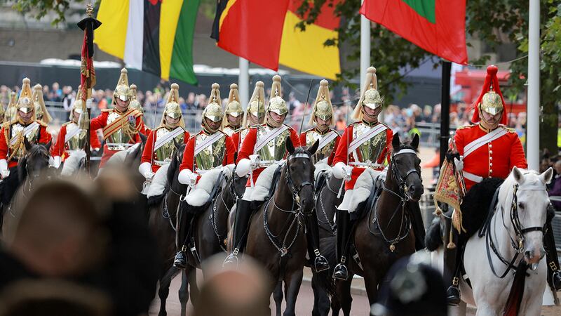 Photos: Crowds gather ahead of Queen Elizabeth II's coffin procession Royal guardsmen and horses pass by on the day the coffin of Britain's Queen Elizabeth is transported from Buckingham Palace to the Palace of Westminster on September 14, 2022, in London. (Marko Djurica - WPA Pool/Getty Images)