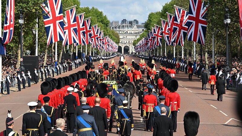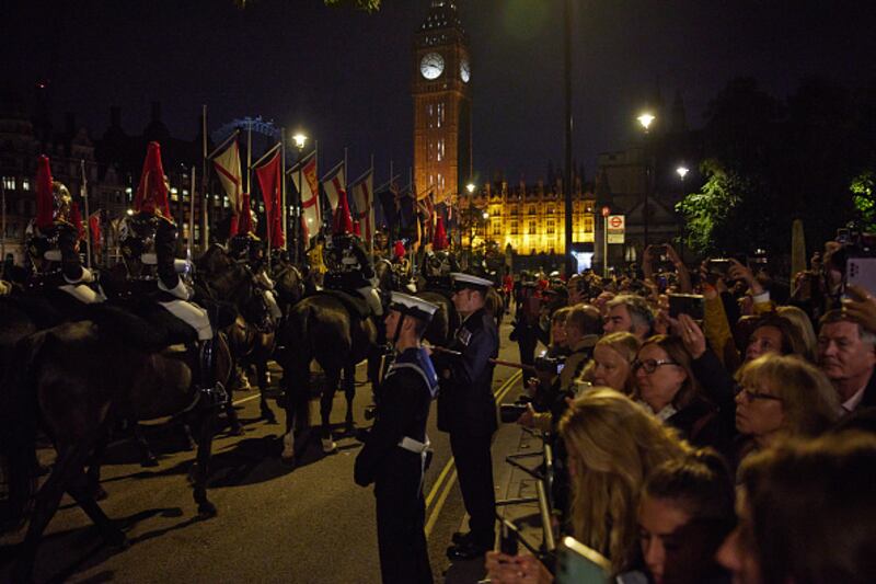 The Coffin Carrying Queen Elizabeth II Is Transferred From Buckingham Palace To The Palace Of Westminster A general view as the coffin of Queen Elizabeth II is escorted into Westminster Hall for the Lying-in State on September 14, 2022 in London, England. Queen Elizabeth II's coffin is taken in procession on a Gun Carriage of The King's Troop Royal Horse Artillery from Buckingham Palace to Westminster Hall where she will lay in state until the early morning of her funeral. Queen Elizabeth II died at Balmoral Castle in Scotland on September 8, 2022, and is succeeded by her eldest son, King Charles III. (WPA Pool/Getty Images)