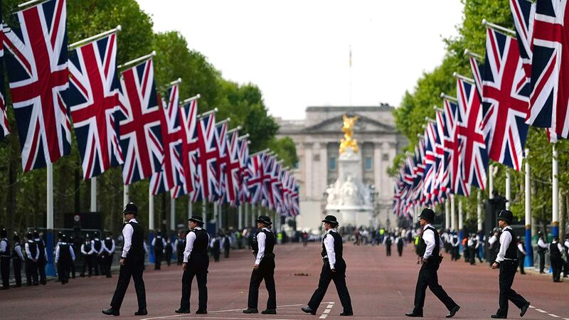 Photos: Crowds gather ahead of Queen Elizabeth II's coffin procession Police officers cross The Mall on September 14, 2022, in London. (Victoria Jones - Pool/Getty Images)