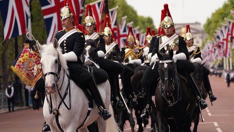 Photos: Crowds gather ahead of Queen Elizabeth II's coffin procession Soldiers of the Household Cavalry ride along The Mall on September 14, 2022, in London. (Marko Djurica - Pool/Getty Images)