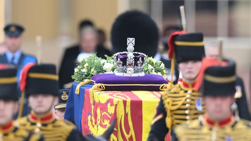 Photos: Thousands line procession route to honor Queen Elizabeth II The Imperial State Crown is seen on the coffin carrying Queen Elizabeth II into Westminster Hall for the Lying-in State on September 14, 2022 in London, England. Queen Elizabeth II's coffin is taken in procession on a Gun Carriage of The King's Troop Royal Horse Artillery from Buckingham Palace to Westminster Hall where she will lay in state until the early morning of her funeral. Queen Elizabeth II died at Balmoral Castle in Scotland on September 8, 2022, and is succeeded by her eldest son, King Charles III. (Dan Kitwood/Getty Images)