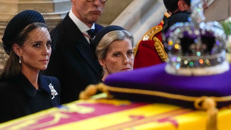 Photos: Thousands line procession route to honor Queen Elizabeth II Catherine, Princess of Wales, left, and Sophie, Countess of Wessex watch the coffin of Queen Elizabeth arrive in Westminster Hall on September 14, 2022 in London, United Kingdom. Queen Elizabeth II's coffin is taken in procession on a Gun Carriage of The King's Troop Royal Horse Artillery from Buckingham Palace to Westminster Hall where she will lay in state until the early morning of her funeral. Queen Elizabeth II died at Balmoral Castle in Scotland on September 8, 2022, and is succeeded by her eldest son, King Charles III. (WPA Pool/Getty Images)