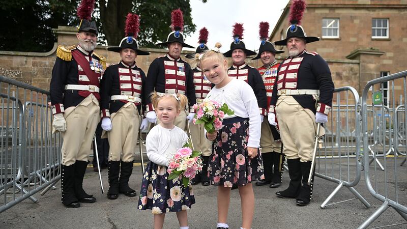 Photos: King Charles III visits Northern Ireland Two young girls pose with the ceremonial guards as they await the arrival of His Majesty King Charles III accompanied by the Queen Consort outside Hillsborough Castle on September 13, 2022 in Hillsborough, Northern Ireland. King Charles III is visiting Northern Ireland for the first time since ascending to the throne following the death of his mother, Queen Elizabeth II, who died at Balmoral Castle on September 8, 2022. (Photo by Charles McQuillan/Getty Images) (Charles McQuillan/Getty Images)