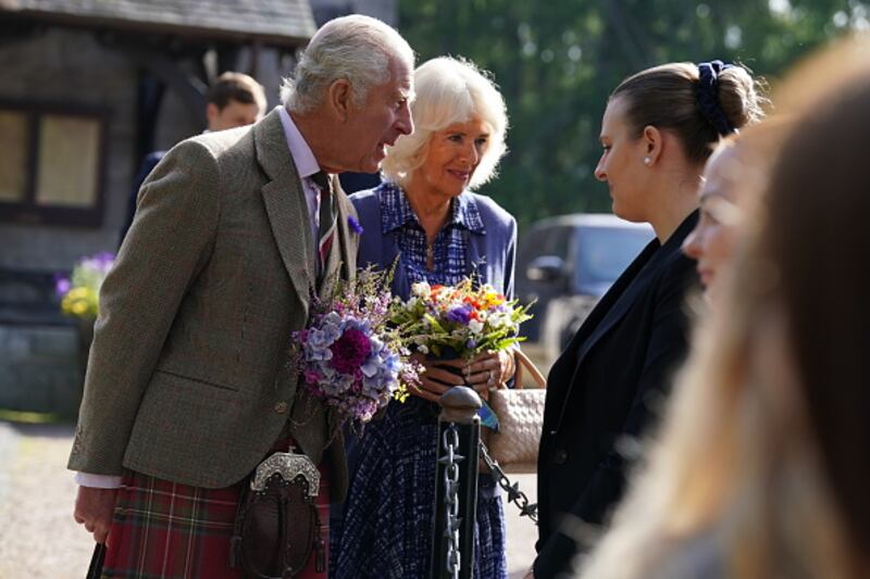 Remembering Queen Elizabeth II CRATHIE, ABERDEENSHIRE - SEPTEMBER 8: King Charles III and Queen Camilla meet estate staff and members of the public as they depart Crathie Parish Church following a church service to mark the first anniversary of the death of Queen Elizabeth II on September 8, 2023 in Crathie, Aberdeenshire. Queen Elizabeth II passed away her Balmoral Castle, her private Scottish residence on September 8th 2022, bringing to an end her 70-year reign, the longest of a British monarch. Her funeral was held at Westminster Abbey on 19 September and she is buried in St George's Chapel at Windsor Castle. (Photo by Andrew Milligan - Pool/Getty Images) (Pool/Getty Images)