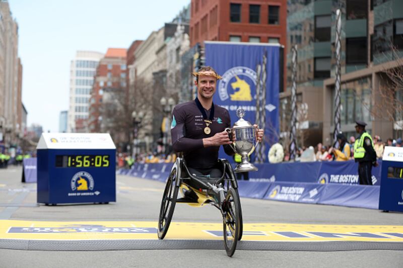 128th Boston Marathon BOSTON, MASSACHUSETTS - APRIL 15: Marcel Hug of Switzerland poses with the trophy on the finish line after winning the professional Men's Wheelchair Division during the 128th Boston Marathon on April 15, 2024 in Boston, Massachusetts. (Photo by Paul Rutherford/Getty Images) (Paul Rutherford/Getty Images)