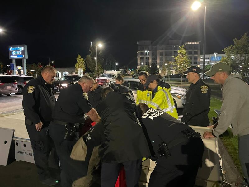 The Beverly Police Department shared what it termed “Breaking Shoebert news” on its Facebook page, saying the animal left Shoe Pond and made its way to the side door of the police station.
