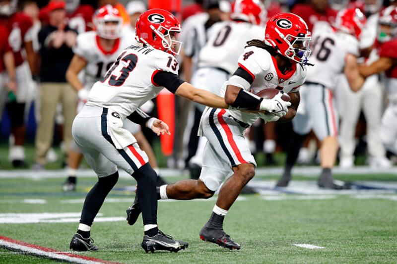Photos: Georgia, Alabama face off in SEC Championship Game 2021 Stetson Bennett of the Georgia Bulldogs hands off the ball to teammate James Cook in the second quarter of the SEC Championship game against the Alabama Crimson Tide at Mercedes-Benz Stadium on December 4, 2021, in Atlanta. (Todd Kirkland/Getty Images)