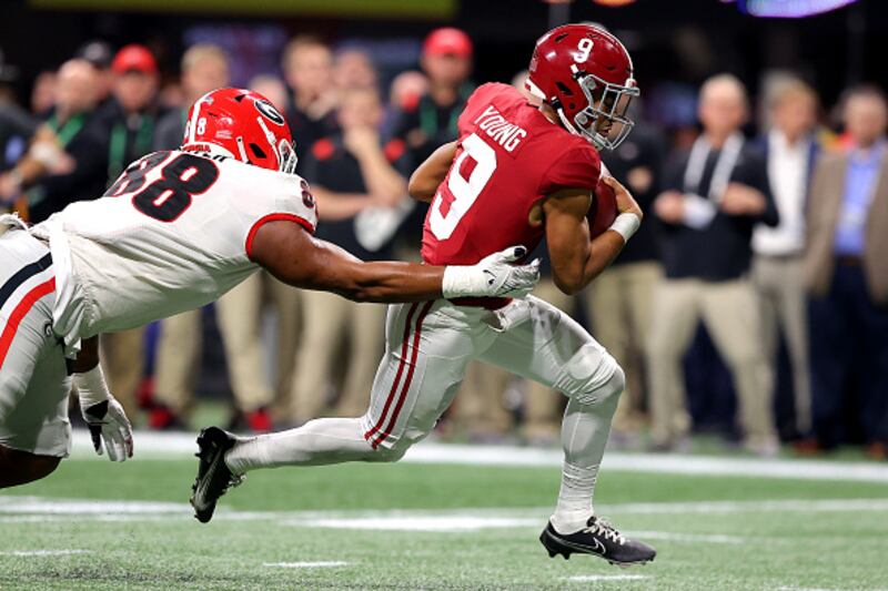 Photos: Georgia, Alabama face off in SEC Championship Game 2021 Bryce Young of the Alabama Crimson Tide carries the ball as Jalen Carter of the Georgia Bulldogs defends in the second quarter of the SEC Championship game at Mercedes-Benz Stadium on December 4, 2021, in Atlanta. (Kevin C. Cox/Getty Images)