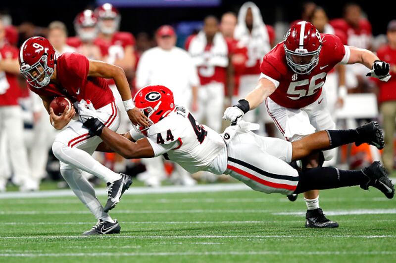 Photos: Georgia, Alabama face off in SEC Championship Game 2021 Bryce Young of the Alabama Crimson Tide looks to pass as Nakobe Dean of the Georgia Bulldogs defends in the second quarter of the SEC Championship game at Mercedes-Benz Stadium on December 4, 2021, in Atlanta. (Kevin C. Cox/Getty Images)