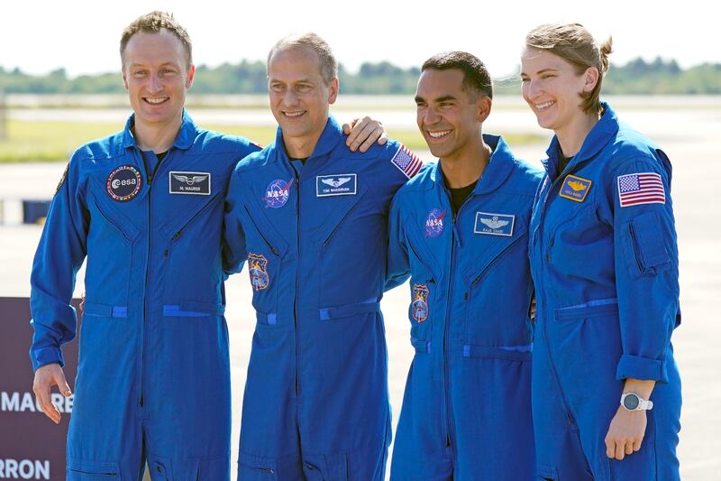 Photos: SpaceX launches Crew-3 astronauts for NASA From left, European Space Agency astronaut Matthias Maurer of Germany, and NASA astronauts Tom Marshburn, Raja Chari, and Kayla Barron gather for a photo after arriving at the Kennedy Space Center in Cape Canaveral, Fla., on Tuesday, Oct. 26, 2021. SpaceX counted down Wednesday, Nov. 10, 2021 toward a nighttime launch the four astronauts who have been grounded for nearly two weeks by weather and medical delays. (AP Photo/John Raoux)