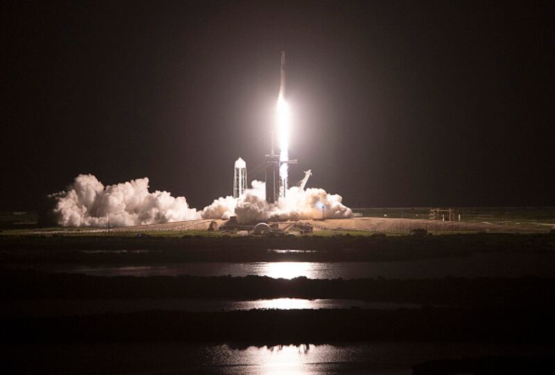 Space X CAPE CANAVERAL, FLORIDA - MAY 30: The SpaceX Falcon 9 rocket with the manned Crew Dragon spacecraft attached takes off from launch pad 39A at the Kennedy Space Center on May 30, 2020 in Cape Canaveral, Florida. NASA astronauts Bob Behnken and Doug Hurley lifted off today on an inaugural flight and will be the first people since the end of the Space Shuttle program in 2011 to be launched into space from the United States. (Photo by Joe Raedle/Getty Images) (Joe Raedle/Getty Images)