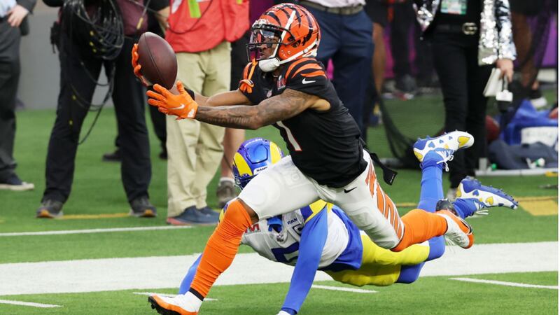 The Bengals won the toss but decided to defer until the second half. That paid immediate dividends when Burrow connected with Higgins for a 75-yard touchdown pass 12 seconds into the third quarter to take a 17-13 lead. It appeared that Higgins grabbed defender Jalen Ramsey’s face mask before making the catch, but no call was made.