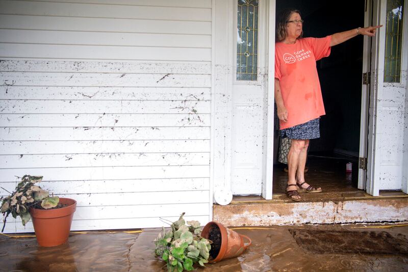 Tennessee flooding With a waterline of dirt and small debris still clinging to her home, Joy Rhodes points to the flooded Garner Creek on Saturday, Aug. 21, 2021, in Dickson, Tenn. (Josie Norris/The Tennessean via AP) (Josie Norris/AP)