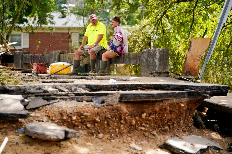 Tennessee flooding People sit on a bridge where a road washed out Sunday, Aug. 22, 2021, in Waverly, Tenn. Heavy rains caused flooding in Middle Tennessee and have resulted in multiple deaths as homes and rural roads were washed away. (AP Photo/Mark Humphrey) (Mark Humphrey/AP)