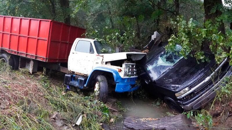 Tennessee flooding A truck and a car sit in a creek Sunday, Aug. 22, 2021, after they were washed away the day before in McEwen, Tenn. Heavy rains caused flooding in Middle Tennessee and have resulted in multiple deaths as homes and rural roads were washed away. (AP Photo/Mark Humphrey) (Mark Humphrey/AP)