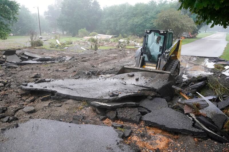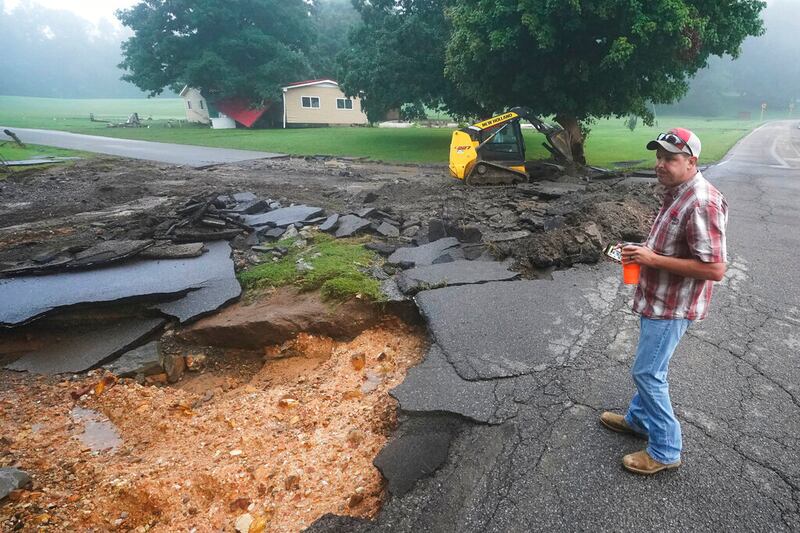 Tennessee flooding Michael Pate watches as a road is repaired Sunday, Aug. 22, 2021, in McEwen, Tenn. Pate repaired the road Saturday after heavy rain washed part of it away, but the road was damaged again when more rain fell Saturday night. Heavy rains caused flooding in Middle Tennessee and have resulted in multiple deaths as homes and rural roads were washed away. (AP Photo/Mark Humphrey) (Mark Humphrey/AP)